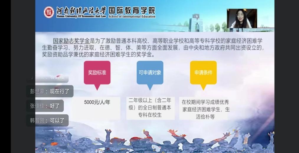 2023年2月12日,1946伟德官方网站20级计算机专业学生、国家励志奖学金获得者李阁作为本次宣传活动大使开展了本次宣讲活动,并邀请2022级部分学生参与本次活动。宣讲会上,主持人李阁为大家详细介绍了国家资助政策体系的主要内容,包括学生最常用到的生源地助学贷款,高校助学贷款,例如助学贷款的资助对象,办理地点,贷款标准,贷款年限以及注意事项等。随后又分别讲解了国家奖学金、国家助学金 、国家励志奖学金的相关鼓励标准和申请条件,兵役资助政策和其相关申请流程,以及绿色通道的办理流程,有利于同学们更好地了解和熟悉国家资助政策。